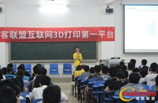 5月19日創(chuàng)客聯(lián)盟與廣東科技學院的同學分享 3D打印技術(shù),四位大牛人物暢享奮斗人生。創(chuàng)客聯(lián)盟創(chuàng)始人陳晶、技術(shù)總監(jiān)黃明光,同時創(chuàng)客聯(lián)盟邀請一覽英才網(wǎng)運營總監(jiān)薛泉源、 東莞集思工業(yè)設(shè)計有限公司首席設(shè)計師鄧少峰共同向同學分享自己的職場價值觀與設(shè)計理念。
