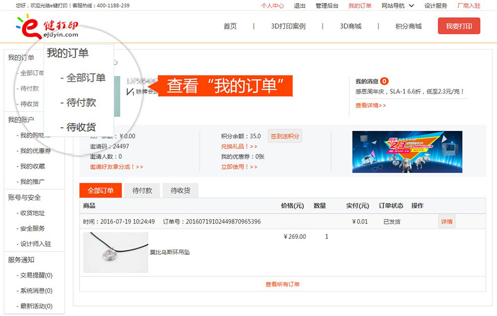 - 最新成交 深圳市3D打印訂單 138****2618 訂單金額¥637.56元 已付款成功